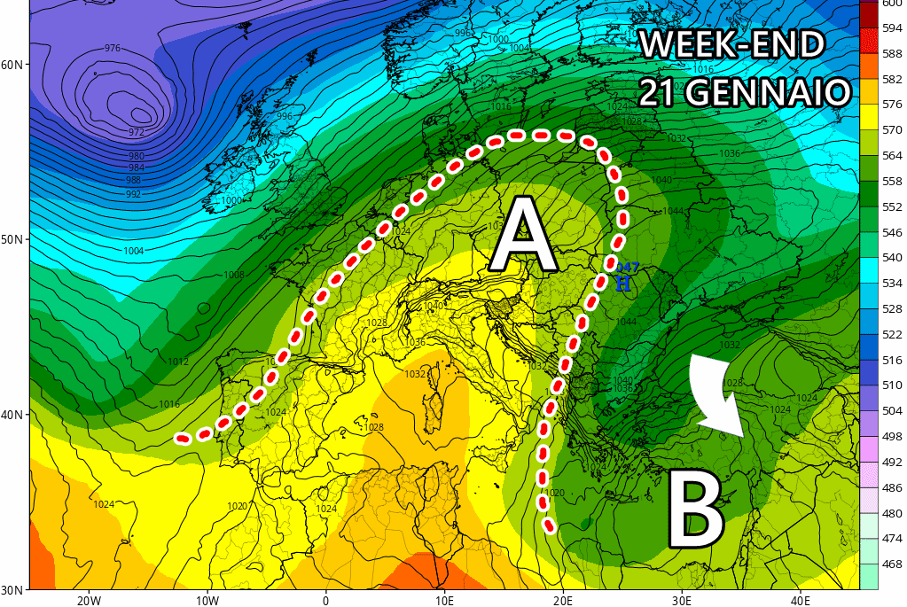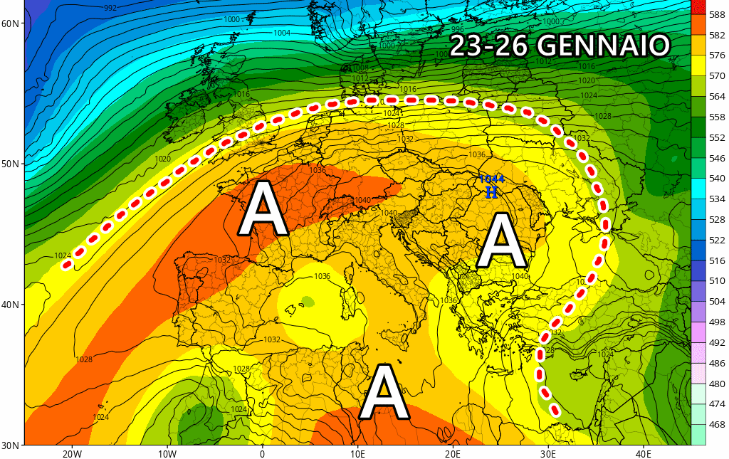 Il momento critico sarà tra 23 e 26 gennaio: tutti i centri di calcolo sono al momento concordi sull’arrivo di questo imponente anticiclone europeo, capace di tenere a debita distanza ogni genere di perturbazione. Le temperature in questo contesto salirebbero specie al centro-sud e in montagna.
