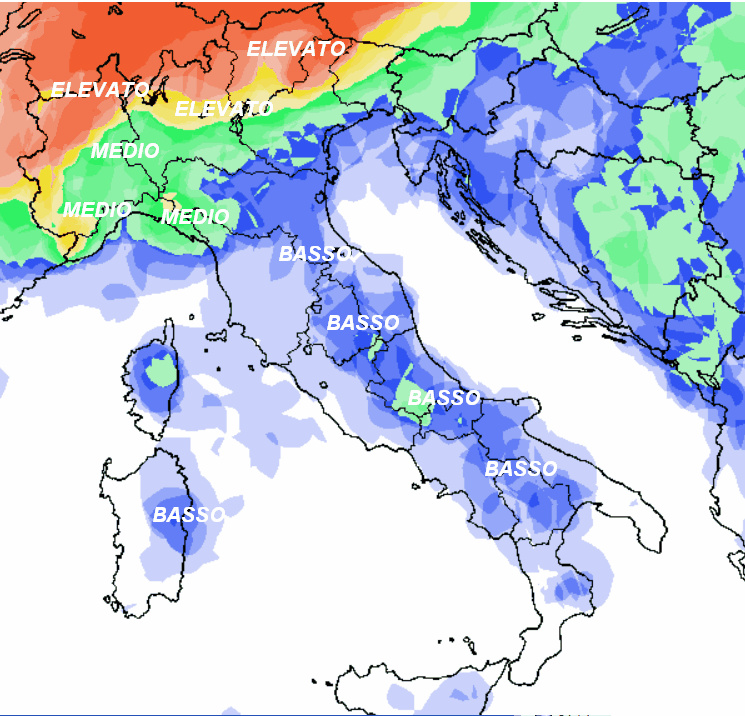 Rischio di temporali ELEVATO su Alpi, Prealpi e forse le zone dell’alta pianura. Rischio MEDIO sul resto del settentrione ad eccezione dell’Emilia Romagna che avrà un rischio BASSO. Rischio BASSO anche lungo tutta la catena dell’Appennino, leggermente più elevato nelle aree interne poste tra Lazio e Abruzzo. Dove vedete il colore bianco sulla mappa il rischio di temporali sarà NULLO.