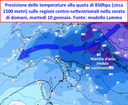 Possiamo già adesso vedere dalle immagini satellitari il sopraggiungere di un nuovo impulso d’aria instabile nord-atlantica che andrà ad interagire con le masse d’aria fredda presenti sull’Europa meridionale. Entro le primissime ore di martedì 10 gennaio ne deriverà la formazione di una figura di bassa pressione ad ovest della Corsica che tenderà a sprofondare rapidamente verso le regioni centrali e meridionali tirreniche, laddove sono previste le precipitazioni più importanti. Qualche debole nevicata potrà riguardare anche l’angolo nord-occidentale a causa di un debole