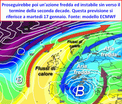 Spingendo il nostro sguardo verso il termine della seconda decade di gennaio, l’aggiornamento serale del modello europeo mette in evidenza una grande circolazione d’aria fredda che riuscirebbe ad espandersi persino alla Francia ed alla Penisola Iberica, ponendo forse le basi per l’avvio di una fase umida con neve anche al nord. Non possiamo tuttavia dimenticarci come la previsione del modello americano rimanga ad oggi fortemente disallineata a questo disegno, proponendo al contrario un addolcimento delle temperature dalla prossima settimana in avanti.