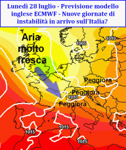 L’aggiornamento serale del modello europeo prevede infatti un’evoluzione ancora una volta improntata all’instabilità che non tarderebbe a manifestarsi già da lunedì 28 con una nuova ondata di temporali. La dinamica di questo passaggio perturbato trarrebbe origine da una circolazione maggiormente propensa agli scambi meridiani. La massa d’aria più fresca verrebbe così prelevata dalle alte latitudini oceaniche per essere scaraventata verso i settori europei meridionali e l’Italia, laddove giungerebbe col proprio carico di rovesci e temporali associati a nuovo calo della temperatura. Al momento questa previsione presenta ampi margini di incertezza, l’affidabilità può essere stimata attorno al 40%.
