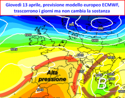 Riguardo l’evoluzione prevista attorno la metà di aprile, viene ancora confermata la persistenza di valori mediamente elevati di pressione e soprattutto geopotenziali alla quota di 500hpa (circa 5500 metri), laddove ritroveremo ancora valori termici sopra la media.