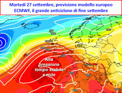 Un discorso particolare merita questa sera la previsione a lungo termine del modello europeo che ormai da alcuni aggiornamenti conferma il rinforzo di un vistoso anticiclone sull’Europa occidentale a coinvolgere una buona fetta del Mediterraneo negli ultimi giorni di settembre. L’anticiclone in questione porterebbe con sè valori estremamente elevati di pressione al suolo, sostenuti da una struttura altrettanto forte lungo la colonna d’aria dell’atmosfera ed andando di fatto a costituire una figura pressochè "inossidabile".