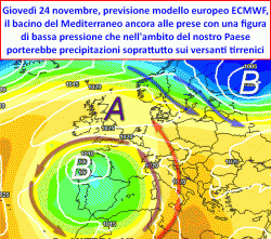Nella seconda metà della settimana corrente, questa stessa depressione riuscirà a compiere qualche passo più deciso verso il bacino centrale del Mediterraneo. In tal modo ci aspettiamo un passaggio perturbato più deciso tra le giornate di giovedì 24 e venerdì 25 novembre, con fenomeni che potranno riguardare non soltanto il nord ma anche le regioni del medio e del basso Tirreno.