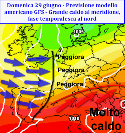 A partire dal fine settimana sabato 28 – domenica 29 giugno andrà infatti prendendo consistenza una vasta depressione carica di aria fredda atlantica con perno sui settori occidentali del continente. L’Italia settentrionale verrà attraversata da un attivo ramo della corrente a getto sud-occidentale che rinnoverà condizioni di instabilità soprattutto sui settori posti a nord del fiume Po. A tal proposito la giornata più instabile è prevista domenica 29 quando il fronte freddo potrebbe interessare parte delle regioni settentrionali.