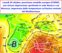 Nel periodo compreso tra domenica 23 e mercoledì 26 ottobre, lo sprofondamento di una figura vistosa di BASSA pressione tra la Penisola Iberica ed il Marocco, innescherà sul Mediterraneo centrale un richiamo di correnti caldo-umide di Scirocco che investiranno in pieno anche il nostro Paese. Al centro ed al sud per una manciata di giorni la temperatura tornerebbe ad essere estiva, al nord potrebbero subentrare episodi marginali di instabilità anche a sfondo temporalesco ma inseriti in un contesto comunque molto mite