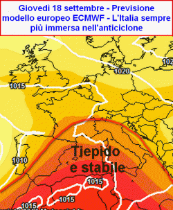 Soltanto sulle lunghe distanze previsionali il centro di calcolo europeo mette in evidenza uno sfondamento parziale di vorticità atlantica in direzione dell’Europa centrale e dei settori italiani settentrionali. L’ingerenza atlantica andrebbe manifestandosi soprattutto nel corso della terza decade di settembre, momento in cui andrebbe risolvendosi l’azione di blocco esercitata dall’alta pressione a favore di una maggiore dinamicità dell’atmosfera. Eventuali precipitazioni sarebbero comunque concentrate sulle regioni del nord mentre sul resto del territorio italiano proseguirebbe la fase stabile e mite che comporterebbe un generale stop precipitativo al centro-sud.