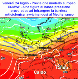 La via d’uscita a questa persistente ondata di caldo, potrebbe arrivare da una saccatura, cioè una figura di bassa pressione alimentata da aria assai più fresca nord-atlantica che negli ultimi giorni di luglio proverebbe ad avvicinarsi al nostro Paese. Sarebbero dapprima coinvolti i settori occidentali d’Europa con particolare riferimento alla Penisola Iberica, in seguito l’instabilità potrebbe (forse) estendersi anche ai settori centrali europei e l’Italia settentrionale.