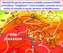 d’aria più fresca in quota che, tra la seconda parte di lunedì 29 e martedì 30 agosto, porterà qualche episodio temporalesco sparso principalmente sulle regioni del nord, poi attenuato anche al centro. Seguirà una modesta riduzione delle temperature che resteranno comunque attestate su valori ancora estivi. Mercoledì 31 agosto l’alta pressione tornerebbe infatti a proteggere agevolmente il Mediterraneo, accompagnata però da un profilo termico un po’ meno elevato.
