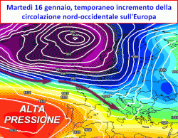 Già a partire da lunedì, una nuova circolazione scalpiterà sull’Europa, laddove un ramo attivo della corrente a getto polare, rimetterà in gioco correnti instabili nord-atlantiche. Con tale circolazione, nel periodo a cavallo tra martedì 16 e venerdì 19 gennaio, vi sarà un via vai continuo di nuvolosità che soltanto occasionalmente potrà dispensare qualche precipitazione lungo i versanti esposti, in genere quelli occidentali