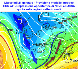 Nei prossimi giorni l’Italia risulterà ancora interessata da una circolazione di aria instabile i cui effetti tenderanno ad essere più sensibili in un primo momento sulle sole regioni settentrionali, per poi trasferirsi gradatamente al meridione col passare dei giorni. L’aria più fredda legata a tali disturbi, tenderà a traferirsi soltanto con gradualità verso i settori di basso Mediterrraneo. Prima di tale migrazione, le regioni settentrionali d’Italia verranno interessate da un impulso d’instabilità che, tra la serata di domani, mercoledì 21 e la mattinata di giovedì 22, riuscirà a portare la neve sino a quote molto basse, segnatamente sull’angolo nord-occidentale.