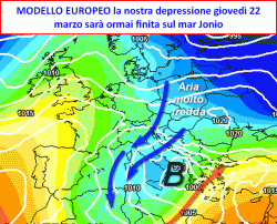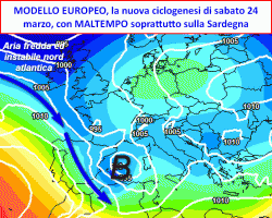 Con l’arrivo del fine settimana (sabato 24, domenica 25), l’aria fredda nord atlantica anch’essa in rotta verso il Mediterraneo. Ne deriverebbe una nuova ciclogenesi con target ancora sulle regioni meridionali, su parte di quelle centrali e soprattutto sulla Sardegna, ove il sabato 24 marzo potrebbe risultare alquanto perturbato. Al nord vi sarebbe una alternanza tra schiarite ed annuvolamenti in un contesto piuttosto secco ma ancora dominato da temperature fredde, sotto la media del periodo.