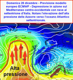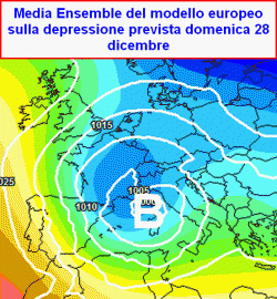 La seconda occasione per neve sarà rappresentata dall’ingresso di una perturbazione nord-atlantica che investirà le regioni settentrionali nella giornata di domenica 28. L’anticiclone delle Azzorre in posizione assai protesa verso nord, favorirà il distacco di una depressione che, muovendosi rapidamente dai settori groenlandesi verso sud-est, investirà dapprima il Regno Unito (sabato 27) e poi le regioni settentrionali italiane (domenica 28). Giunta sull’Italia, l’aria umida convogliata dalla depressione tenderà a sovrascorrere al di sopra di un modesto cuscino d’aria più fredda che sarà presente in Valpadana. La neve sarebbe assicurata sull’angolo nord-occidentale, qualche riserva in più per i settori nord-orientali.