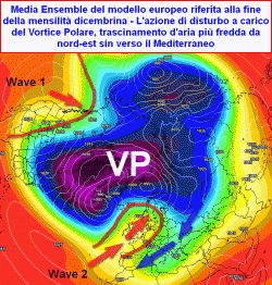 Venerdì 26 dicembre, giorno di Santo Stefano, andranno manifestandosi sul nostro Paese alcune importanti modifiche alla circolazione atmosferica generale: l’alta pressione delle Azzorre tenderà infatti ad elevarsi lungo i meridiani dell’oceano, favorendo sull’Italia una discesa d’aria fredda di origine polare. L’arrivo del freddo che impegnerà l’Italia tra Santo Stefano e sabato 27, rappresenterà il prodotto finale di un’azione di disturbo a carico del Vortice Polare. Dinamiche complesse che prevedono sostanzialmente una trasmissione d’onda che dall’oceano Pacifico (Wave 1) giunge all’oceano Atlantico, attraverso l’elevazione della famigerata Wave 2, attrice protagonista dei nostri inverni europei.