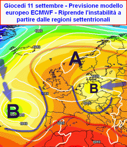 L’aggiornamento serale del modello europeo pone risalto all’avvio di una nuova fase d’instabilità che inizierebbe a portare i propri effetti partendo da giovedì 11 settembre. Risulta ancora incerto il comportamento della depressione prevista in formazione sulla penisola Iberica, le cui sorti dipenderanno essenzialmente dalla possibilità o meno che quest’ultima venga agganciata dalla corrente a getto in discesa dalla regione canadese.