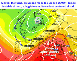 Al settentrione un’interminabile "sfilata" di nubi medio alte (castellani sabbiosi) verranno trasportate dalla propaggine più occidentale della corrente a getto subtropicale, posta a stretto contatto con il secondo, più importante ramo della corrente a getto polare. Proprio le regioni del nord diverranno infatti "terra di conflitto" tra le masse d’aria oceaniche molto fresche ed instabili, contro quelle arroventate ma estremamente stabili portate dall’onda calda africana.