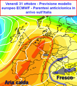 Con l’arrivo del primo weekend novembrino (sabato 1 – domenica 2) l’anticiclone posto poco ad ovest dell’Italia, tenterà di occupare in modo più deciso il nostro territorio, ambendo a far piazza pulita della nuvolosità anche sulle regioni meridionali che comunque saranno le ultime ad uscire in modo definitivo dalla circolazione instabile che tiene impegnati i cieli d’Italia già da diverse giornate. Le prime regioni ad uscirne, come è facile immaginare, saranno quelle settentrionali che già in queste ore sperimentano condizioni di tempo buono. In questo caso l’arrivo dell’alta pressione sarà testimoniato dalla graduale attenuazione della ventilazione orientale, evento associato ad un aumento della temperatura soprattutto alle quote superiori.