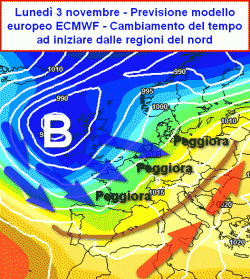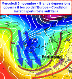 A tal proposito l’aggiornamento serale del modello europeo pare avere le idee molto chiare, calcando addirittura la mano su di uno scenario già abbozzato dalle linee di tendenza precedenti. A partire da lunedì 3 novembre infatti, l’intero territorio europeo ricadrebbe nelle mani di una vasta circolazione depressionaria che veicolerebbe sul nostro Paese sistemi nuvolosi in successione. Una massa d’aria polare-marittima scenderebbe di gran carriera dai settori settentrionali dell’oceano Atlantico ma la sua influenza, almeno inizialmente si limiterebbe ai soli settori europei occidentali e l’Inghilterra. Il bacino centrale del Mediterraneo (e quindi anche l’Italia) ricadrebbero invece nel fitto letto di correnti umide e piovose facenti capo un minimo di bassa pressione centrato sul golfo di Biscaglia.