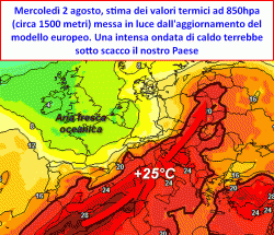 Questa sera l’aggiornamento del modello europeo calca la mano su valori intensi di CALDO che si farebbero sentire soprattutto nei primi giorni di agosto. Alla quota di 850hpa (circa 1500 metri), vengono pronosticati picchi di caldo sino a +25°C sulle regioni del centro e del sud, valori degni delle peggiori ondate di caldo estivo. Se le cose stessero davvero così, su alcune di queste regioni sfondare nuovamente la soglia dei +40°C non sarebbe un’ipotesi utopistica.