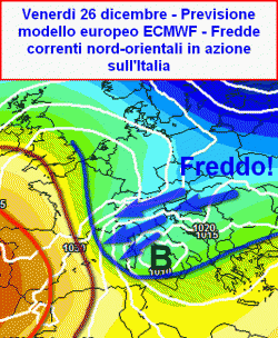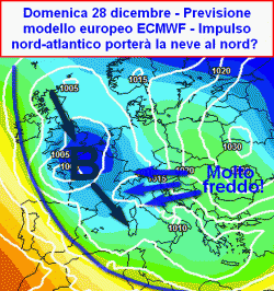 Le prime manovre invernali comincerebbero tra venerdì 26 (Santo Stefano) e sabato 27, quando sull’Italia sopraggiungerebbe una massa d’aria più fredda responsabile di un abbassamento sensibile della temperatura sopratutto al nord ed al centro Italia. Atteso un calo termico sino a 10 gradi in meno rispetto ai valori attuali. Domenica 28 un nuovo impulso d’instabilità proveniente dal nord-Atlantico, potrebbe determinare un peggioramento delle condizioni atmosferiche al nord ed al centro, in questa sede possibile neve sino in pianura nell’angolo nord-occidentale. (da confermare)