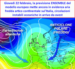 Nei prossimi giorni, per un brevissimo periodo, la circolazione di venti occidentali capitanata dalle ampie depressioni di origine canadese, riporteranno un po’ di mitezza sui settori europei occidentali ed in parte anche sul nostro Paese. Sarà però una fase assolutamente temporanea, in quanto lo sviluppo successivo degli eventi porterà ad una trasformazione dell’intera circolazione atmosferica europea nella terza ed ultima decade di febbraio.