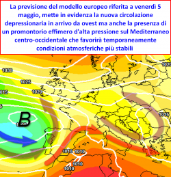 Ne deriverebbe l’affermazione di una nuova circolazione di venti sud-occidentali che andrebbero ad interessare l’Europa meridionale ed i bacini settentrionali del mar Mediterraneo. Tale circolazione trasporterebbe con sè corpi nuvolosi in marcia verso le regioni del nord Italia, dove il tempo tornerebbe ad essere instabile. (periodo 10-15 maggio)
