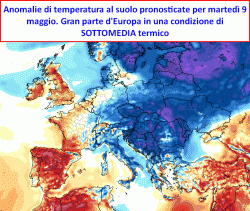 sabato 6 e domenica 7 maggio; il suo movimento dalla Penisola Iberica ai settori centrali d’Europa, sarà agevolato dalla presenza di una seconda, grande figura depressionaria che risiederà col proprio perno in sede scandinava.