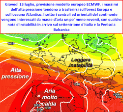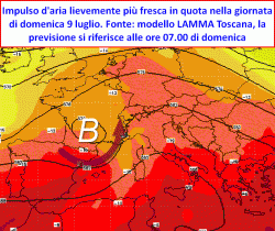 Proprio domenica 9 luglio le regioni dell’Italia settentrionale subiranno le conseguenze portate da questo "disturbo" che andrà ad inserirsi all’interno del nostro anticiclone, trasportando sui nostri arroventati territori, una massa d’aria leggermente più fresca. Per le regioni alpine, prealpine ed i settori di pianura a nord del fiume Po, entro domenica sera potranno manifestarsi alcuni forti temporali a cui farà seguito un lunedi caratterizzato da un profilo termico leggermente meno elevato, mentre il gran caldo proseguirà imperterrito al centro ed al sud.