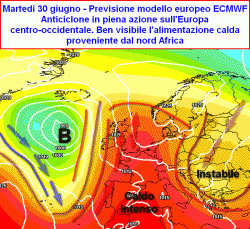 La calura moderata portata dall’alta pressione delle Azzorre, verrà gradualmente sostituita dall’intervento di una componente africana alle quote superiori. Quest’ultima si manifesterà attraverso un aumento delle altezze geopotenziali alla quota di 500hpa. Con l’arrivo degli ultimissimi giorni di giugno, assisteremo infatti ad un vero e proprio "taglio" della jet stream tutt’ora ben rappresentata alle latitudini settentrionali dell’oceano e dell’Europa.