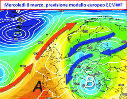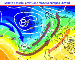 sul Mediterraneo e sull’Europa a cavallo tra sabato 4 e martedì 7 marzo.Verranno dapprima coinvolte le regioni occidentali con precipitazioni che nel fine settimana saranno concentrate soprattutto al nord, la Sardegna e sui versanti del medio ed alto Tirreno. Tra lunedì 6 e martedì 7 marzo, estensione dei fenomeni anche sul Mezzogiorno, con rovesci sparsi e possibilità di temporali. Una risalita di venti sciroccali potrebbe ancora inasprire il maltempo al nord ma su questo sono necessarie delle conferme. Valori termici abbastanza miti, ventilazione generalmente meridionale.