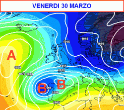 Volgendo lo sguardo a prua e arrivando a venerdì 30 marzo, una depressione in sede iberica metterà correnti umide meridionali sull’Italia con piogge sparse al nord e lungo le regioni tirreniche (terza mappa).