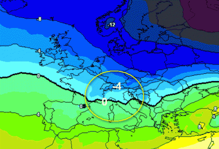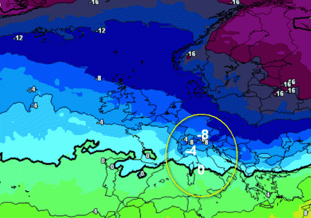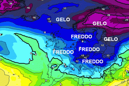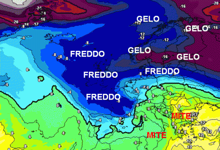 L’isoterma -4° finirebbe sulle Alpi e la (sempre a 1500 metri) taglierebbe le Marche, la Toscana e il Mar Ligure. In altre parole, un’ondata di freddo al nord senza infamia e senza lode.