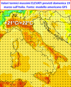 Questa nuvolosità non riuscirà invece a raggiungere il meridione, i versanti adriatici e la Valpadana, laddove soprattutto su quest’ultima regione sono previsti attivarsi venti molto tiepidi di favonio pronti a far schizzare la colonnina di mercurio sin verso valori di +22°C/+24°C.