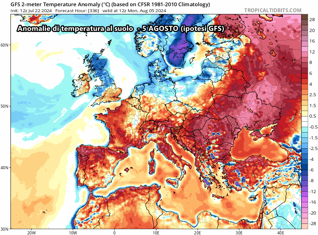 Non a caso, le anomalie di temperatura previste nei primi 5 giorni di agosto delineano un quadro certamente molto più caldo del solito non solo sul Mediterraneo, ma davvero clamorose sono le temperature al suolo al momento previste dal modello americano GFS per il 5 agosto. Fortunatamente, si tratta solo di ipotesi a lungo termine, ma questa attuale previsione ci mostra un’Europa quasi totalmente avvolta dal caldo con temperature di molti gradi superiori alle medie del periodo, soprattutto sull’Europa dell’Est.