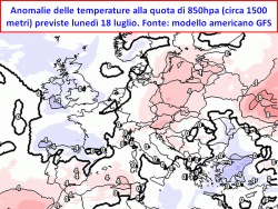 Anche i valori termici stimati dal modello americano GFS sembrerebbero tollerabili, una prima stima delle temperature alla quota di 850hpa (circa 1500 metri) nel periodo compreso tra sabato 16 e mercoledì 20 luglio oscillerebbero infatti in un range compreso tra +12 e +18°C. I picchi più elevati sul finire della seconda decade, con valori stimati nuovamente vicini a +20°C.