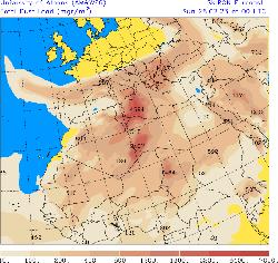 Nella mappa sopra, elevate concentrazioni di sabbia in cielo fra Sabato e Domenica al Sud. Picchi importanti sulla Sicilia.