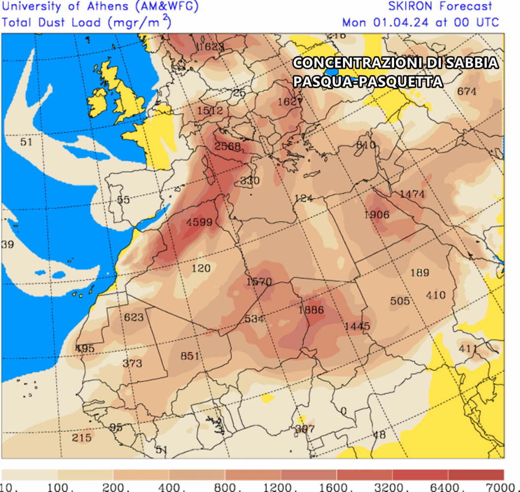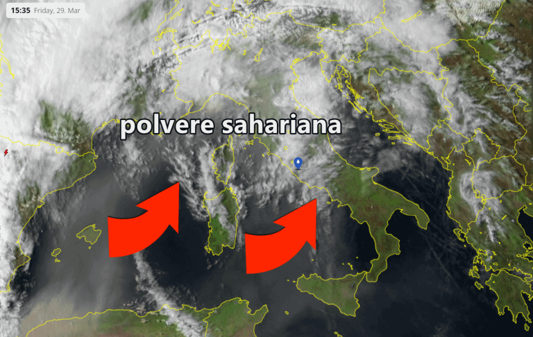 Si tratta di concentrazioni di polvere decisamente ragguardevoli che inevitabilmente percepiremo con i nostri occhi, sia a Pasqua che a Pasquetta, considerando che il cielo ci apparirà totalmente velato, sporco e lattiginoso. Parte di questa polvere precipiterà al suolo assieme a piogge e temporali tra Pasqua e Pasquetta, prima al Nord, poi sulle regioni centrali e marginalmente anche al sud tra la sera di Pasquetta e le prime ore di martedì 2 Aprile.