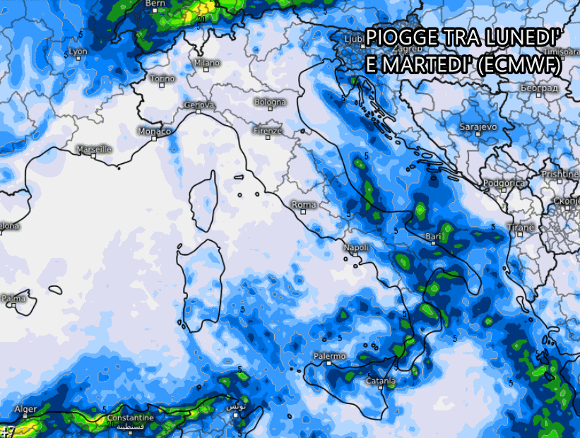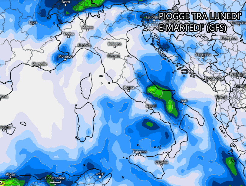 Il modello americano GFS mostra piogge in arrivo lunedì su Marche, Abruzzo, Molise e occasionalmente sul Lazio, poi nel corso di martedì avremo instabilità anche su Campania, Puglia, Basilicata ed estremo sud.