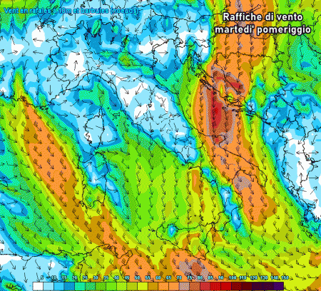 Il vento di maestrale si rinforzerà rapidamente anche su Sicilia e Calabria tra la notte e la mattina di martedì, anche in questo caso con raffiche fino a 80 km/h. Contemporaneamente si rinforzerà la tramontana sul medio-basso Adriatico con raffiche fino a 80 km/h (burrasca) specie lungo le coste. La tramontana raggiungerà la massima intensità nel corso del pomeriggio di martedì su Abruzzo, Molise, Puglia, Basilicata, per poi attenuarsi molto gradualmente.