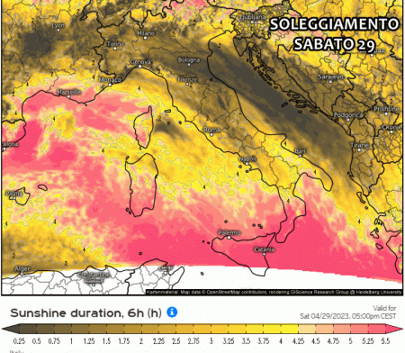 Dalla mappa del soleggiamento previsto sabato, tra tarda mattina e pomeriggio, possiamo notare la presenza di tanta nuvolosità su centro e nord Italia. Insomma non sarà una bella giornata di Sole per tutta Italia!