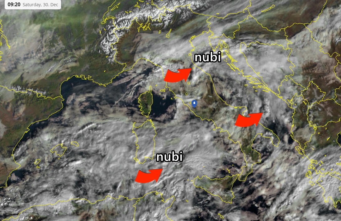 Come ci mostra anche l’immagine del satellite, l’Italia è sovrastata da una vasta copertura nuvolosa e non mancano anche i classici banchi di nebbia in Val Padana. Queste nubi sono associate a un blando fronte caldo di una veloce perturbazione proveniente da ovest: piogge al momento non ce ne sono, ma entro San Silvestro il fronte più organizzato porterà delle precipitazioni principalmente al nordest, Lombardia, Liguria centro-orientale e Toscana.