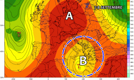 L’Italia si ritrova ancora una volta divisa in due, essendo situata tra due differenti figure bariche: da un lato, l’anticiclone nordafricano che si è espanso su gran parte dell’Europa centro-occidentale e del Centro e Nord Italia; dall’altro, un ciclone che da pochi giorni ha preso vita nel Mar Ionio e che ha duramente colpito la Grecia con alluvioni molto dannose per la popolazione.