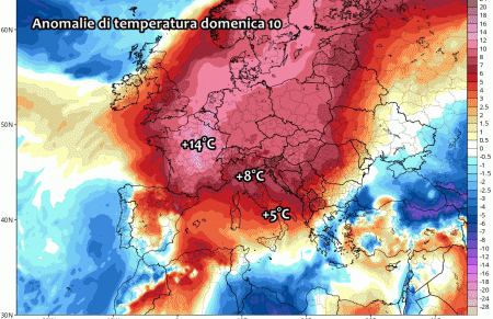 La giornata più calda sarà quella di domenica, quando ci aspettiamo anomalie di temperatura piuttosto importanti su gran parte d’Italia. Sia chiaro, le anomalie più marcate ed eccezionali le troveremo sull’Europa centrale, dove addirittura si prevedono temperature fino a 14°C al di sopra delle medie del periodo sul territorio francese. In Italia, osserviamo anomalie fino a 7 o 8°C oltre le medie al Nord, attorno ai 5°C oltre le medie al Centro e tra 2-3°C oltre le medie al Sud: