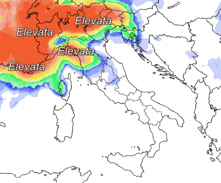 La parte più intensa del passaggio perturbato è prevista nella notte tra sabato e domenica, con precipitazioni anche di un certo peso su Liguria, Alta Toscana, alto Piemonte, alta Lombardia e regioni del Triveneto. Sulla fascia pedemontana dell’alta Lombardia e del Veneto sono attesi fino a 60 – 80 mm di pioggia, mentre sull’Appennino Ligure e toscano attesi fino a 40 – 60 mm di pioggia. Ecco la probabilità della pioggia calcolata dal modello americano per la notte tra sabato e domenica: