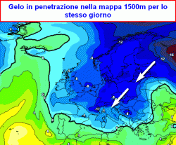 Ecco uno degli schemi barici che potrebbe potenzialmente concretizzarsi a metà mese, se il vortice polare decidesse davvero di spingere una delle sue lingue sull’Europa, potrebbe davvero essere questo: un ponte anticiclonico tra le Azzorre e la Russia, passando per la Scandinavia e un fiume di aria fredda che si metterebbe in moto verso Europa centrale ed Italia, supportata dal vortice depressionario presente anche sul nostro meridione che fungerebbe da richiamo.