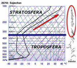 Per quanto riguarda i radiosondaggi occorre solo andare a pescare il luogo giusto dove il calore sta scorrendo verso l’alto. Solitamente questa zona la si trova al di sopra dell’anticiclone delle Aleutine nel caso della cosiddetta "wave1", o sull’Atlantico nel caso della "wave 2", ma è molto più agevole utilizzare apposite sezioni verticali dell’atmosfera che mettono bene in evidenza quanto calore stia salendo e dove. Nell’immagine è allegato il radiosondaggio del’area aleutinica, durante un episodio di stratwarming imminente: si nota chiaramente che la curva della temperatura, linea di destra, si innalza fortemente nella parte alta del grafico (ingresso in stratosfera) e raggiunge valori pari o addirittura superiori a quelli del suolo.