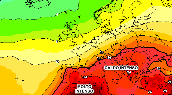 Si nota chiaramente come il caldo intenso riprenda possesso della Penisola, oltre a quasi tutto il bacino del Mediterraneo. Le condizioni meteorologiche associate saranno nel complesso buone, fatta eccezione per qualche temporale di stagione sulle Alpi e lungo la dorsale appenninica nel pomeriggio.