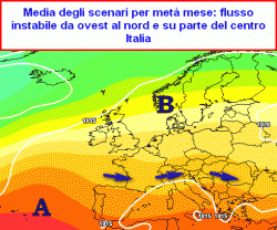 Anche la media degli scenari per la metà del mese propone un’evoluzione simile, anche se non così estrema: flusso perturbato atlantico piuttosto basso di latitudine e passaggio di perturbazioni al nord e al centro. Nessun vero caldo nemmeno al sud.