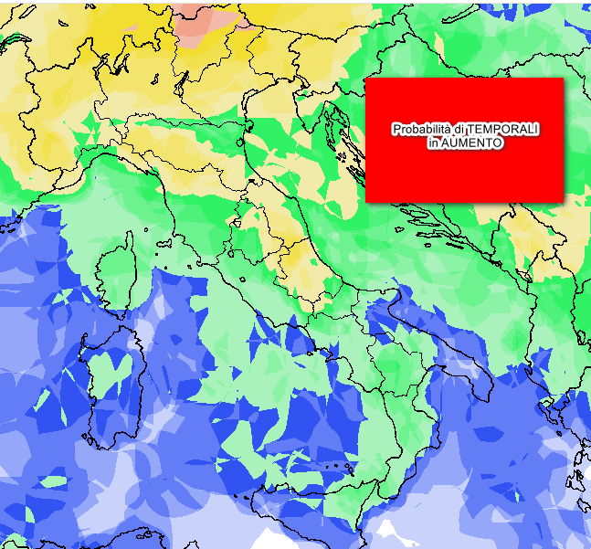 A scala italica si nota un generale aumento della probabilità di piogge e temporali. Fenomeni soprattutto al nord e al centro, ma in estensione anche a gran parte del meridione, segnatamente nelle aree interne. Temperature in graduale calo.