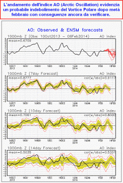 Nella prima cartina abbiamo evidenziato la previsione del modello americano circa la possibile conseguenza di un rallentamento del getto zonale entro la terza decade di febbraio. La seconda cartina mostra invece l’andamento sulla previsione dell’indice AO (Arctic Oscillation).